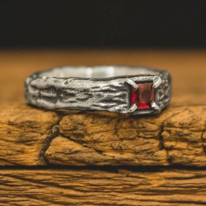 A Aliança Emotion traz uma peça de tamanho intermediário, de 6mm, com entalhes rústicos e uma pedra quadrada facetada. Para saber o seu tamanho: (Clique aqui)