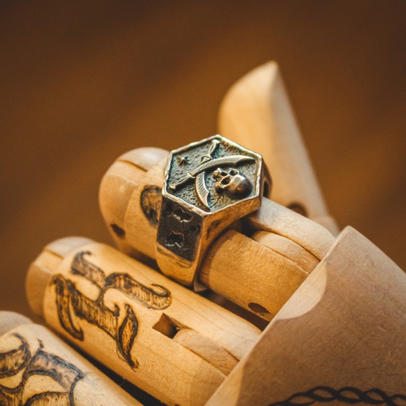 O Anel pirata “Espadas” é feito sob um modelo hexagonal, com uma caveira sem maxilar e 2 espadas cruzadas na parte de cima. As laterais possuem alguns entalhes simulando um mapa antigo.