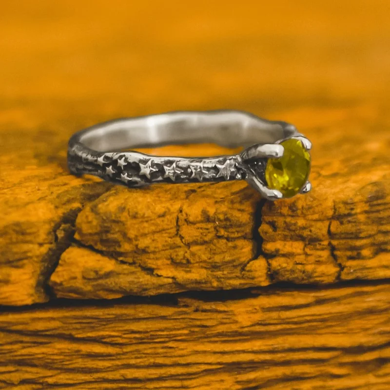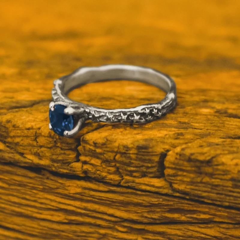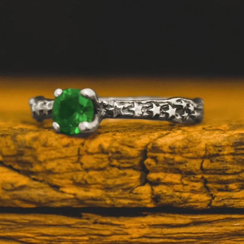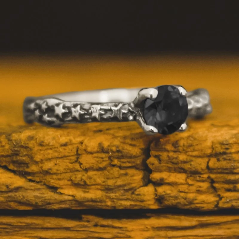 O anel solitário Star é rústico e cercado por várias estrelas em seu design, é delicado e possui diversas opções de pedras: onix, safira, rubi, esmeralda, entre outras. Feito em prata 925.